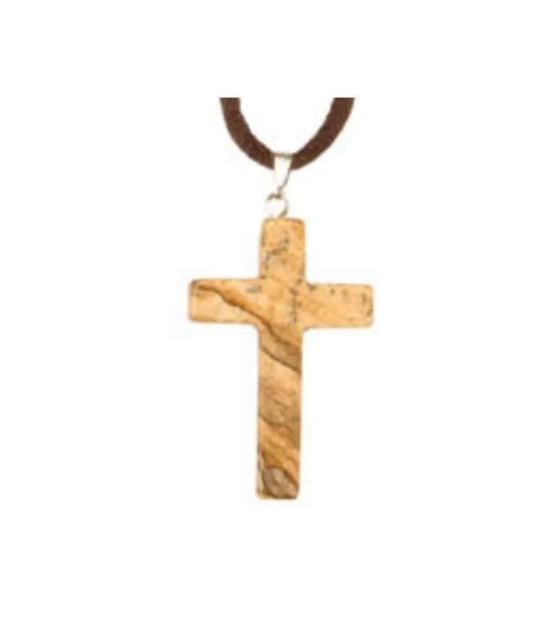 Korsvedhæng i jaspis-sten. Farven er en blanding af brune toner.