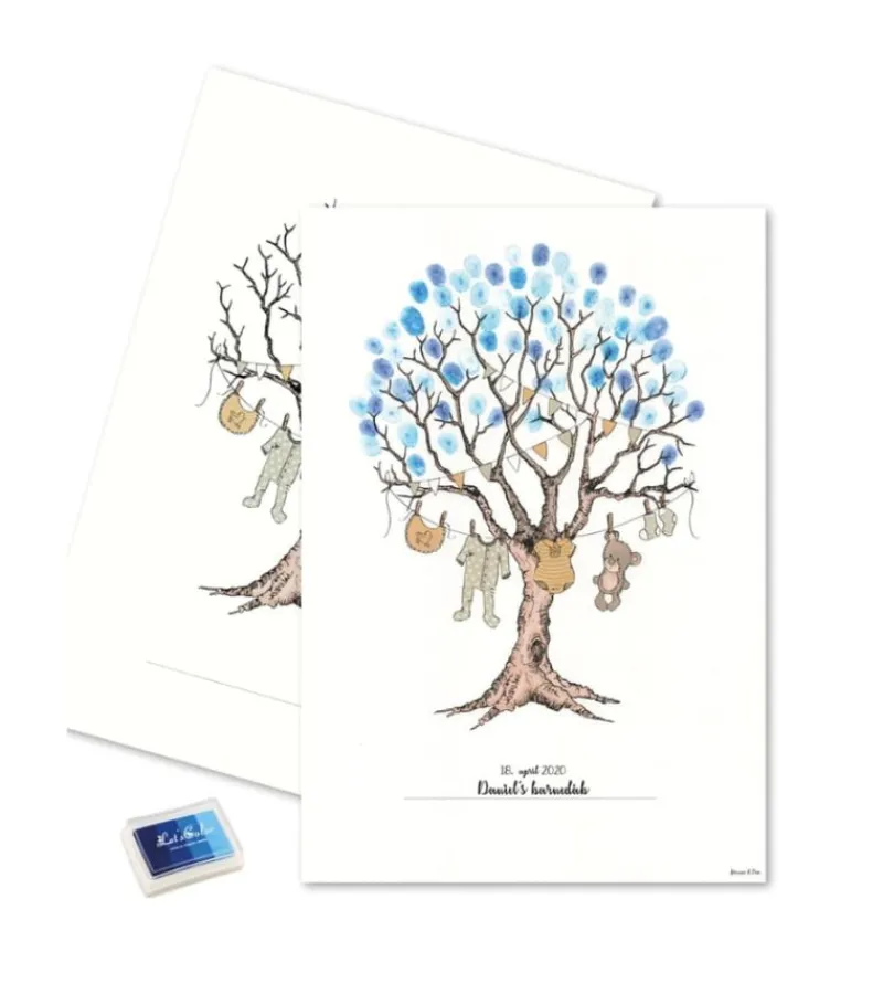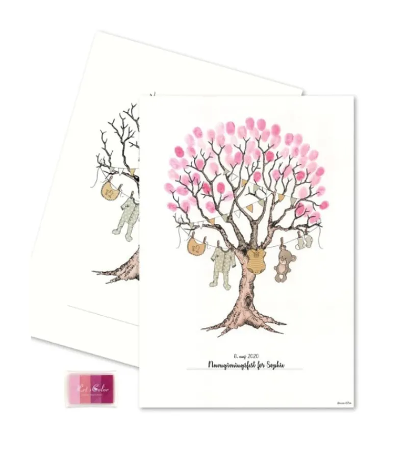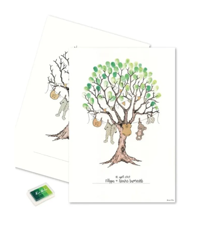 Gæsterne sætter sit fingeraftryk som små “blade” på barnedåbstræet, og skriver evt. navne eller initialer indeni bladet. Plakaten kan både bruges i forbindelse med barnedåb eller barnevelsignelse.