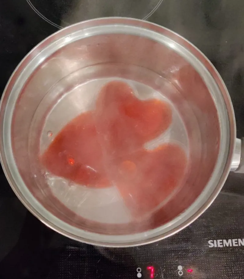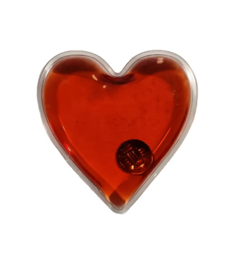 Læg hjertet i kogende vand i ca 10 minutter, så bliver indholdet flydende igen, og du kan derefter, når som helst trykke på metalknappen for at varme hjertet igen.