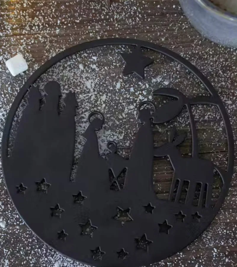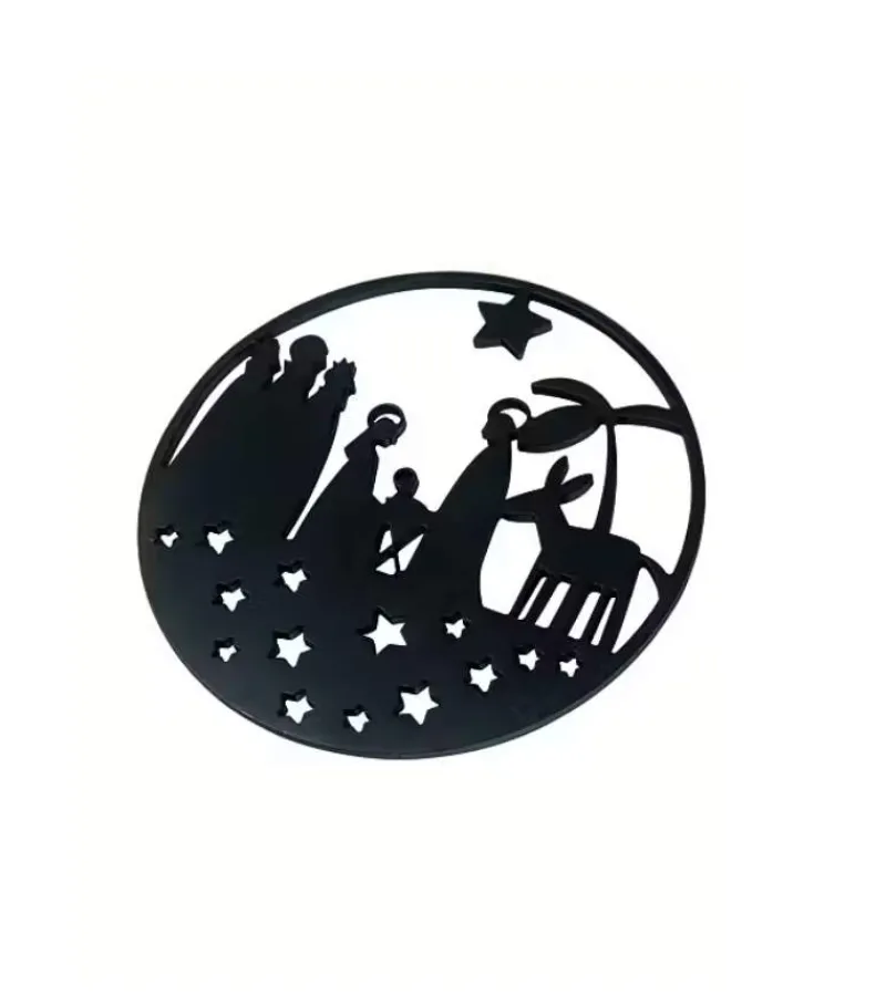 Flot bordskåner med julekrybben til julebordet i sort metal med en blank finish.