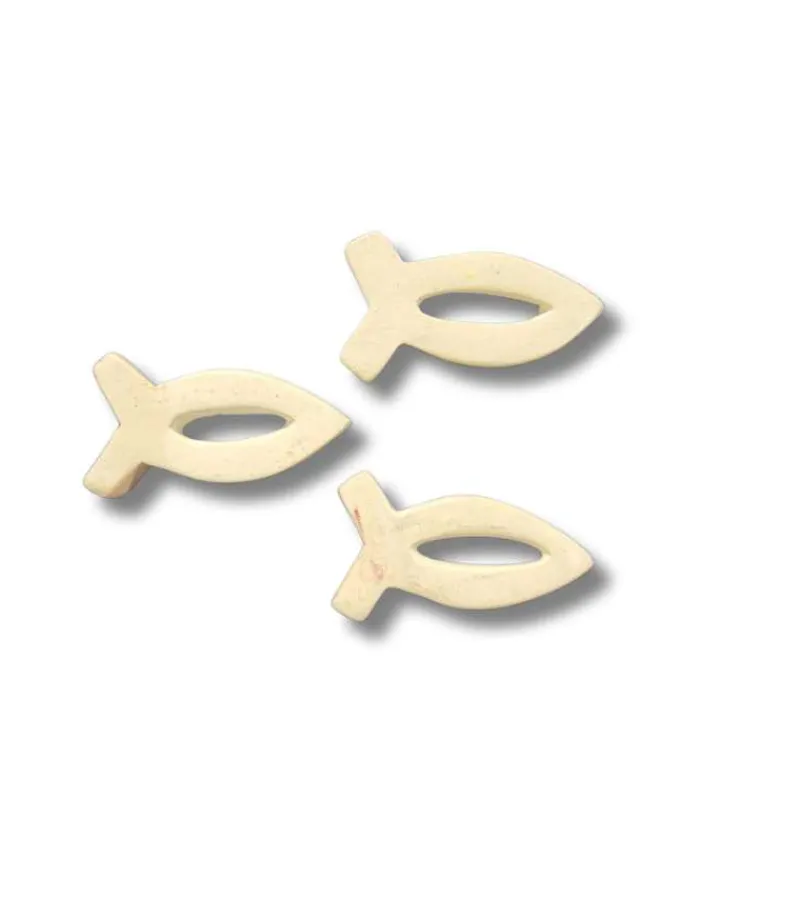 Flotte håndlavet fedtsten der symboliserer fisk/ichthys- I grå/hvid nuancer.