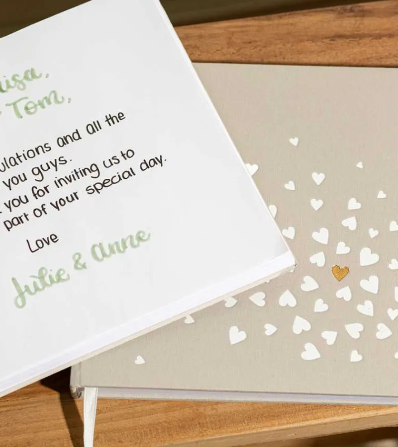 Denne flotte Gæstebog kan bruges til en fest, hvor gæsterne kan skrive en hilsen til brudeparret.