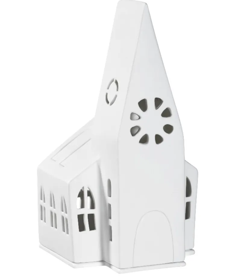 Fin kirke i porcelæn, hvor man kan sætte et stearinlys ind i, og der kommer “liv” i kirken.