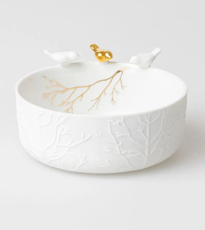 Smuk skål med fugle med kanten. Skålen har et smukt udtryk med træmotiver både på ydersiden og indersiden. Server dine yndlingssmåkager i denne smukke skål med farverne hvid og blank guld.