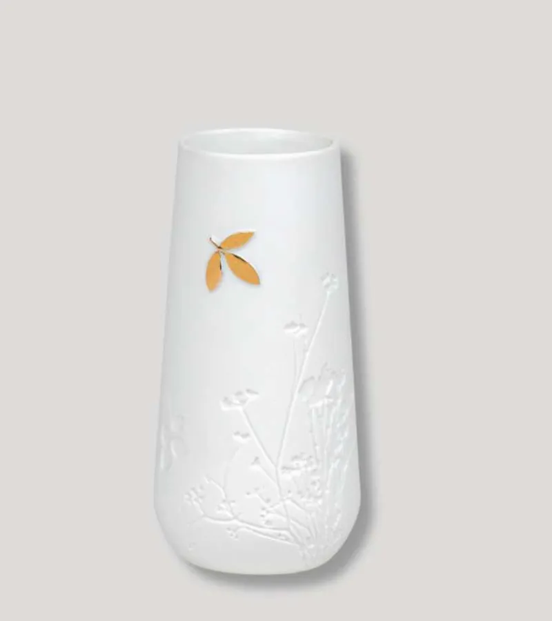 Håndmalet, lille, hvid vase med fint blomsteraftryk og et enkelt smukt blad, der skiller sig ud med sin guldfarve. Vasen har rå porcelæn på ydersiden og er glaseret på indersiden.