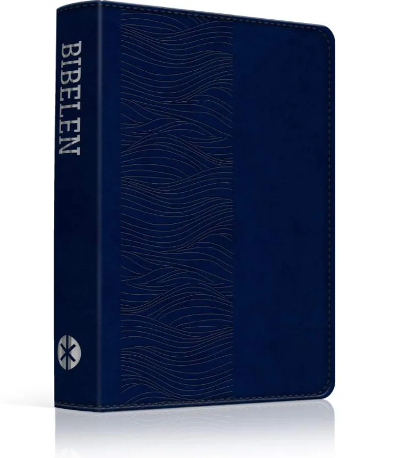 Bibelen på Hverdagsdansk i kraftig navy kunstlæder med et embose tryk af bølger der bruser.